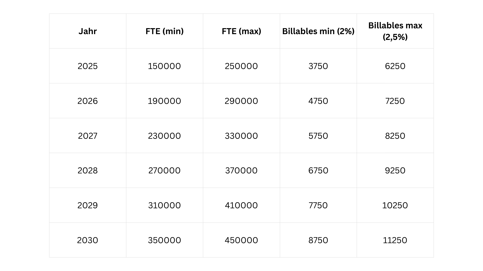 Tabelle 3 – Temp-Billables Calculation 2025–2030 (Min/Max-Szenarien)