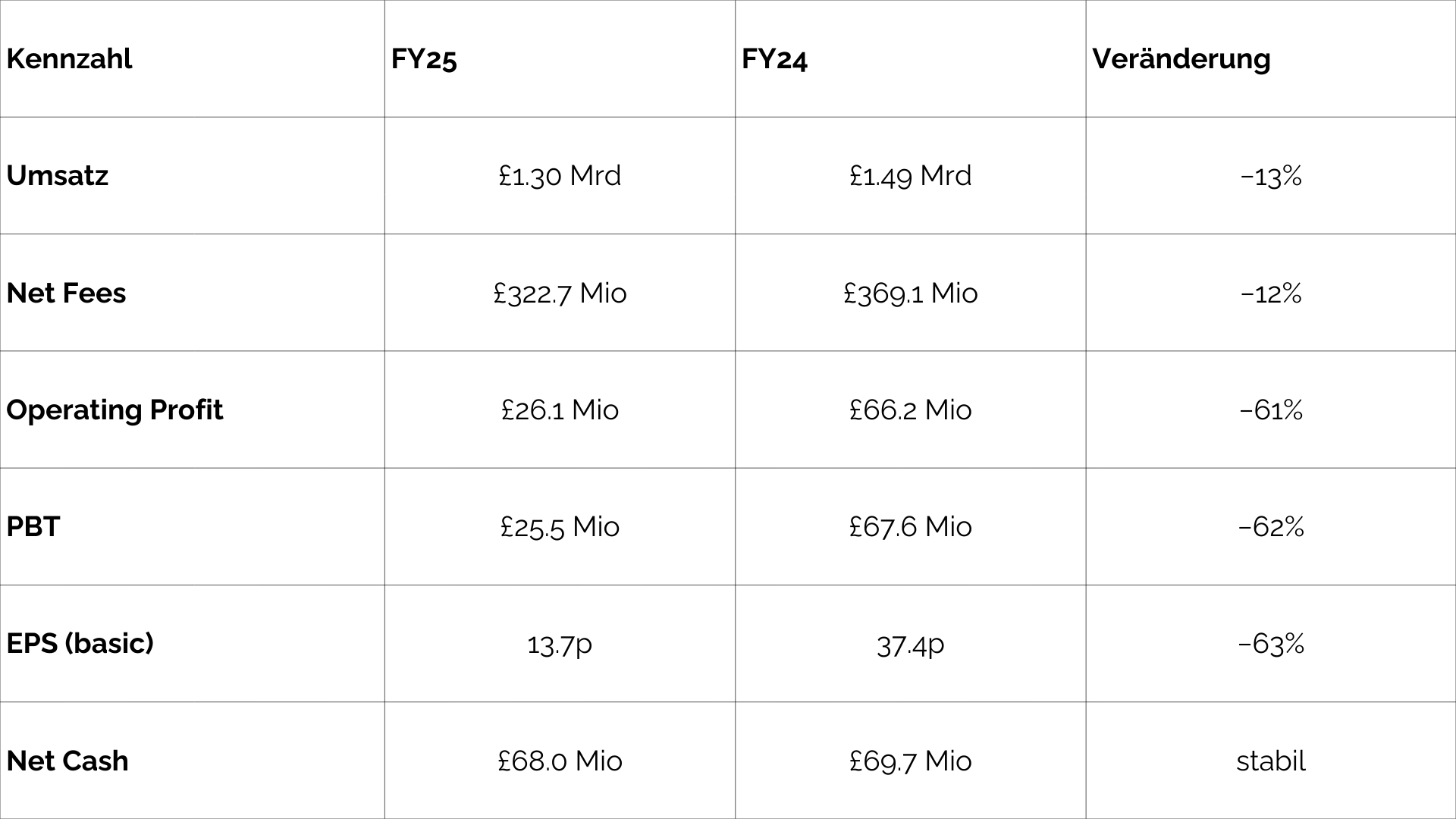 Hays hat ihren FY25 in einem herausfordernden Umfeld mit rückläufigen Net Fees und stark gesunkenen Operating Profits abgeschlossen, zeigt aber durch Kostendisziplin und Contracting-Geschäft Stabilität, während Perm-Hiring der Hauptdruckfaktor bleibt. Q4 zeigt weiterhin Zurückhaltung und weiterhin Bedarf an schmerzvollen Einschnitten.